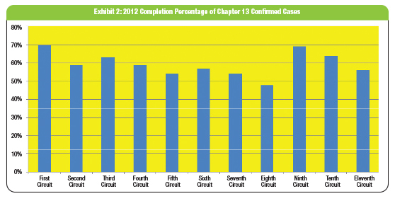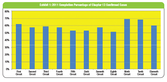 For the last two years, chapter 13 trustees have attempted to determine the success rate of chapter 13 cases based on the discharge rate of confirmed cases instead of filed cases. The authors have polled fellow trustees and asked them to provide the number of cases confirmed and the number of cases discharged for the calendar years 2011 and 2012. These years were chosen because we have to go back to a year where all case outcomes have been decided and no cases are active. We have to go back this far to get complete information, since most chapter 13 cases last at least three years and many last five years.